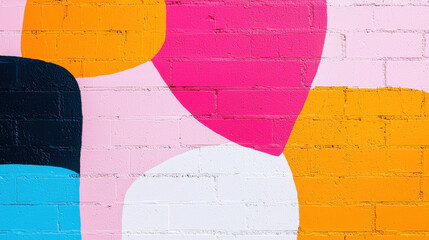 Colorful abstract mural on a brick wall featuring bold shapes in pink, orange, blue, and white, creating a vibrant urban street art aesthetic.