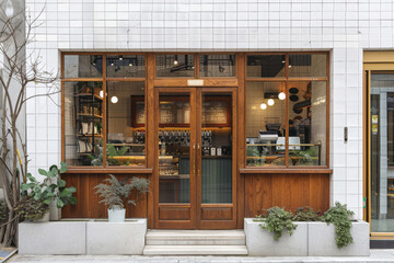 A small cafe with a wooden door and a window