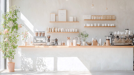 Bright and modern cafe interior featuring minimalistic design, natural light, and stylish decor.