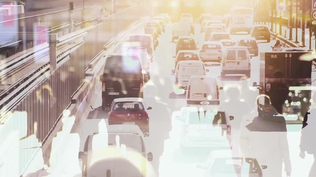 double exposure of people walking on the street and cars driving on road, urban commuters cityscape