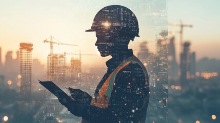 Silhouette of a construction worker wearing a hard hat, holding a tablet, with a futuristic city skyline in the background. The image blends technology and urban development, highlighting progress and