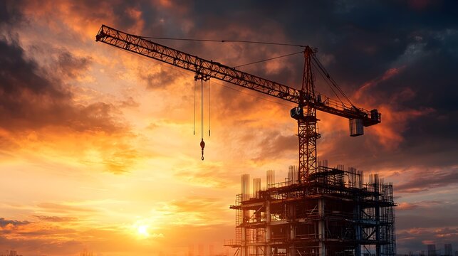 Silhouetted construction crane against an orange and pink sky at sunset over an ongoing building development project