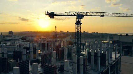 construction crane building architecture urban development property concrete scaffold montpellier France sunset glow behind tower crane over new skyline