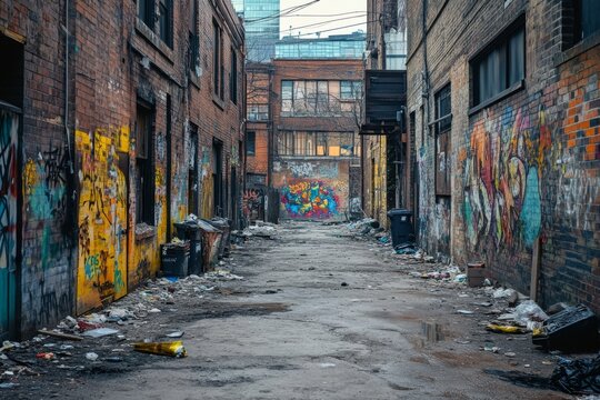 A gritty, abandoned urban alley featuring vibrant graffiti and dilapidated structures, capturing the rawness and decay of the inner city.