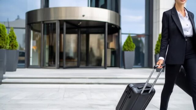 Businesswoman Arriving at Hotel with Luggage for Corporate Travel.