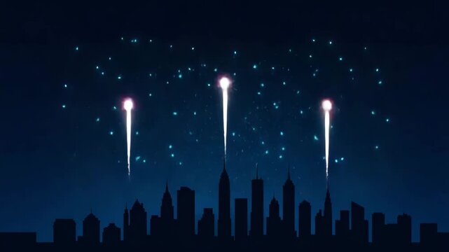 Animated fireworks exploding in vibrant colors over a dark city skyline at night for celebration concept and festive holiday events