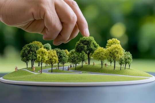 A close-up of hands arranging tiny trees and figurines on a model of an urban park