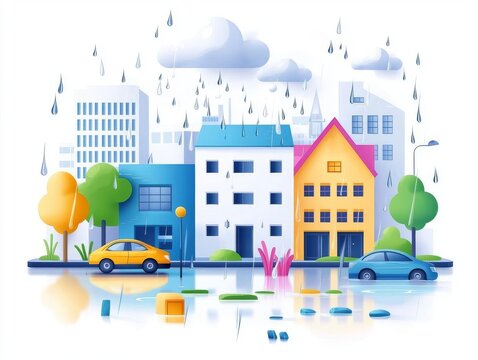 Colorful urban architecture with rain and flooded streets, showcasing modern design and vibrant atmosphere.