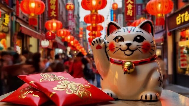 Maneki-Neko figurine waving with red envelopes on a table in a crowded Asian street with lanterns