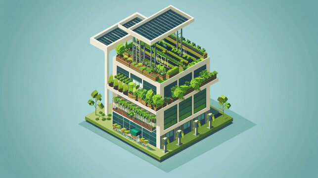 An isometric building icon of a sustainable urban farm, incorporating vertical farming and renewable energy sources.