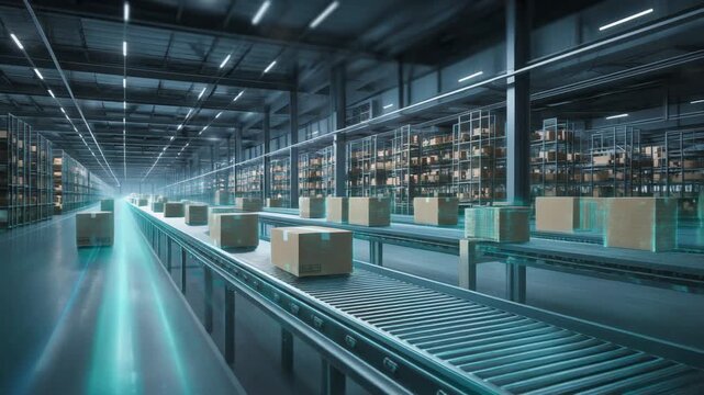 Futuristic warehouse with automated conveyor system and packages, showcasing modern logistics technology