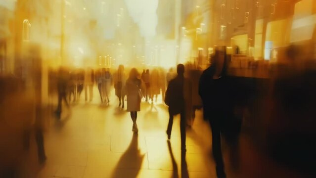 A diverse crowd of people walking through a city street at night. The image is blurred, capturing motion and giving a sense of hustle and bustle. Bright lights from surrounding buildings create a