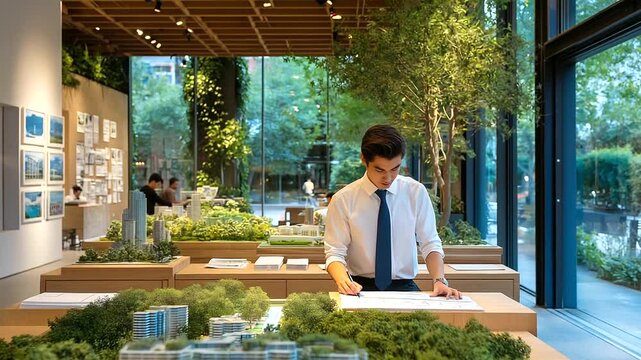 An intern files permits in a city planning office with maps spread across desks blueprints pinned to walls phones buzzing with inquiries and urban models displayed on a table