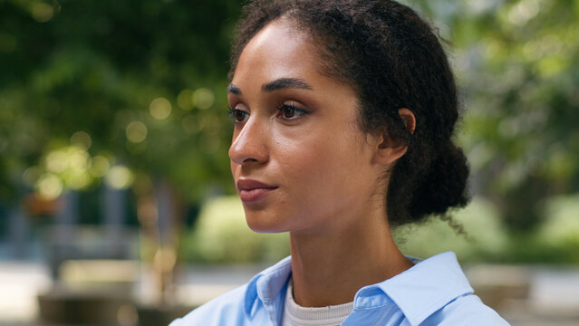 Portrait calm serious face ethnic African American student girl female business woman businesswoman lady entrepreneur manager in city urban outdoors pensive thoughtful looking away thinking pondering