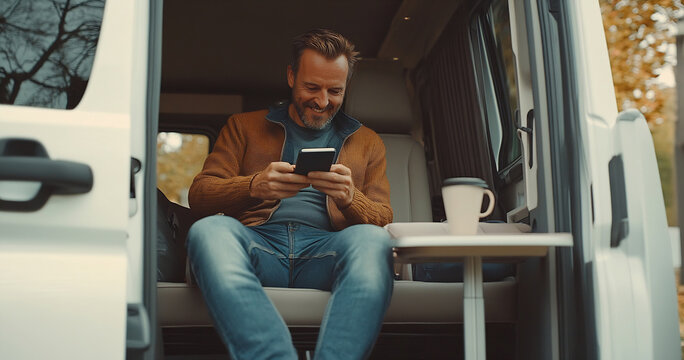 Man sips coffee in camper