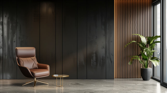 Interior of a contemporary white living room with a white sofa, small entrances, and a wooden floor. Two mock up black armchairs. Generative AI