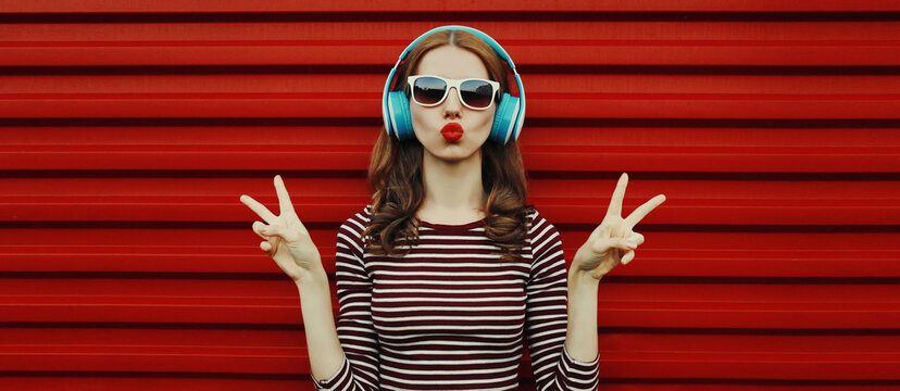 Portrait of young woman in wireless headphones listening to music on a red background