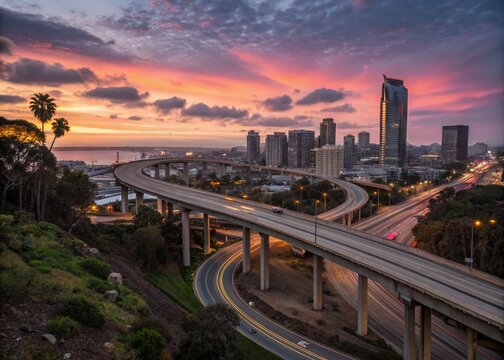 A giraffe in the midst of busy city traffic creates a whimsical and humorous scene, showcasing the juxtaposition of wildlife in an urban setting at dusk.