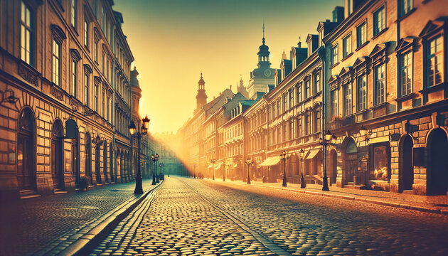 Dawn's First Light on Historic City Streets. The warm glow of morning light on cobblestone streets and historic buildings, rendered in nostalgic retro colors
