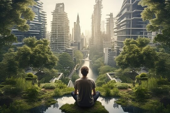 People enjoy a walk on a green urban path, showcasing eco-living in the city