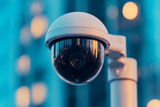 A security camera affixed to a pole is shown, it monitors the surroundings and contributing to surveillance and public safety in a modern setting.