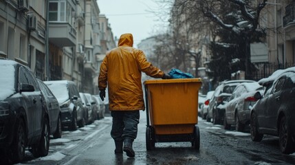 Rain-soaked garbage collector braving harsh weather, pushing waste cart along empty street, reflecting resilience and dedication to essential urban services in challenging conditions
