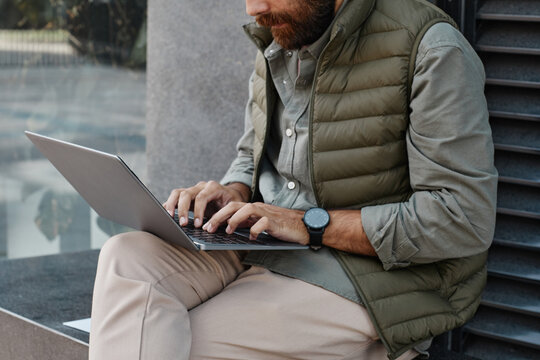 Bearded man sitting on stone bench outside, hands on laptop keyboard, wearing green vest and casual attire, focused on screen in urban setting