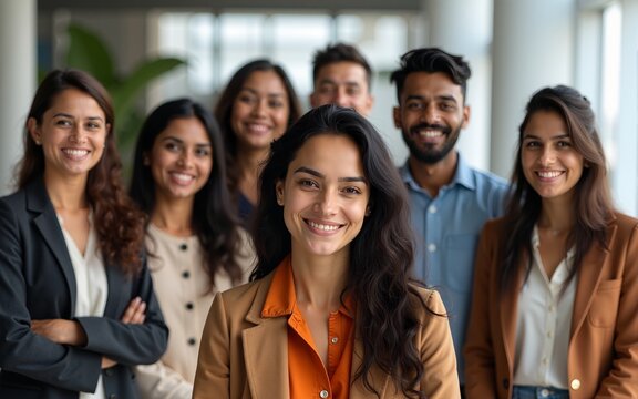 Group of Happy Multiethnic Indian Team of Female and Male Managers, Specialists and Business Professionals Posing for Camera and Smiling. Portrait of a Confident South Asian Team Leader Standing First