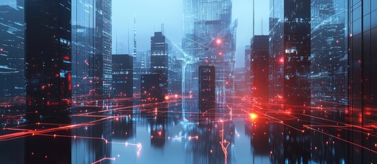 Modern Cityscape Skyline with Tall Skyscrapers, Office Buildings, Urban Business District, Blue Tones, Flat Vector Illustration, Architecture, Downtown Metropolis, Commercial Real Estate