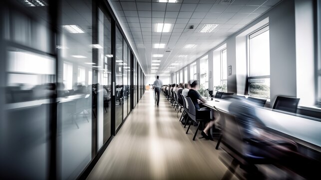 Office corridor, long exposure, motion blur effect, modern business center interior with blurred rushing people. Indoor background. Office life concept. AI generative image.