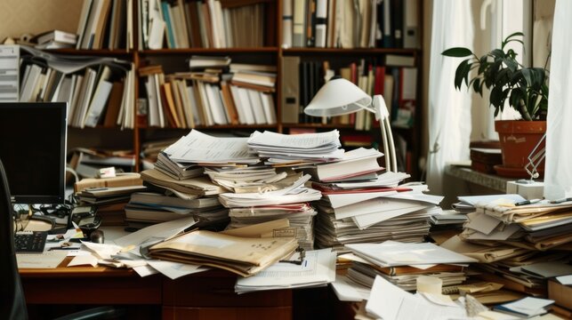 A small office desk covered with an overflow of documents and reports, creating a sense of chaos and urgency in the workplace.