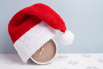 Alarm clock covered with santa hat on color background. Holiday Countdown