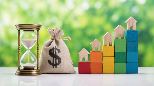 A vintage hourglass with sand flowing, symbolizing time and urgency a burlap money bag with a black dollar sign printed on it, representing finance and savings and a stack of colorful wooden blocks.