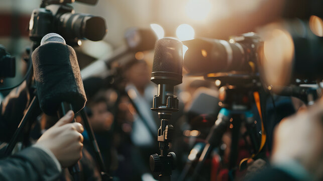 Close-up shot of journalists with microphones at press conference. Business or political meeting with media coverage. Public relations PR and media relations concept in business and politics.