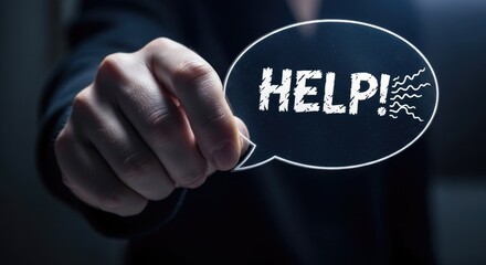 Hand holding speech bubble with 'help!' text in emphatic white letters