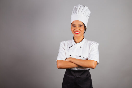 head chef, Brazilian cook, from the Northeast, posing for a photo, smiling. crossed arms.