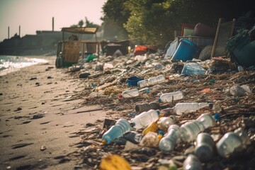 A striking photo of a polluted beach, with the emphasis on the overwhelming amount of plastic waste that is polluting our oceans.