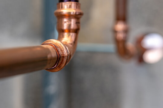 Press-fit fittings, copper pipe plumbing connections and fittings for new potable water pipes in a bathroom.