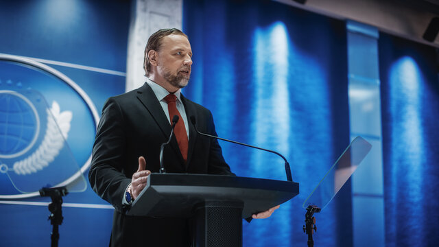 Charismatic Organization Representative Speaking at a Press Conference in USA Government Building. Press Office Representative Delivering a Speech at a Summit. Minister Speaking to Congress.