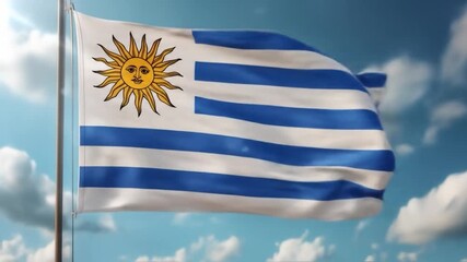 Uruguayan Flag Waving in the Wind Against Blue Sky: A Symbol of National Pride and Identity