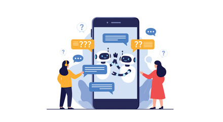 Chatbot and artificial intelligence support concept with users asking questions to friendly robots on a smartphone screen for online customer service.