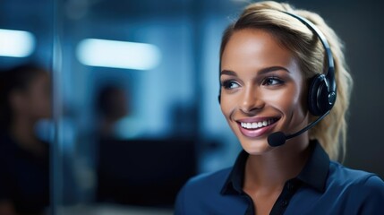 Portrait of a woman at a helpdesk patiently guiding users through technology challenges