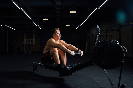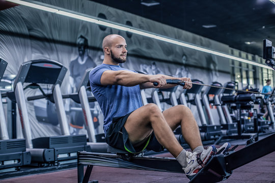 Athletic Man Doing Exercise In Gym, Using Rowing Machine For Developing Power Of Arms
