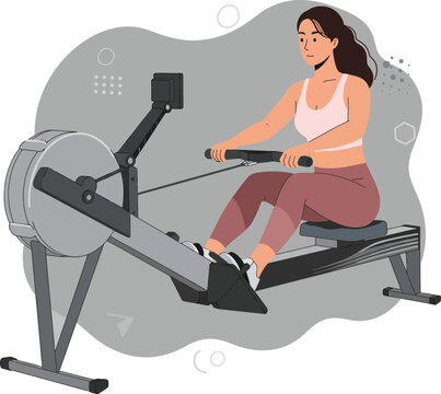 Woman using rowing machine in gym, showcasing focused workout and natural sunlight