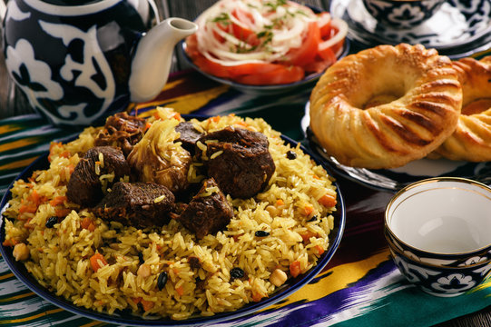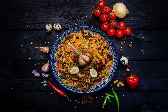 Pilaf- traditional asian dish, rice prepared with vegetables and meat. Oriental, uzbek style.