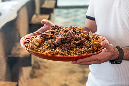 National food - uzbek pilaf with meat in plate with traditional pattern. waiter delivers pilaf in the restaurant