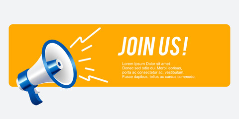We are hiring.Design with black megaphone and voice bubble on yellow background in retro style.Template with open vacancy and hiring information.For print, banner, label.Flat style.Vector illustration