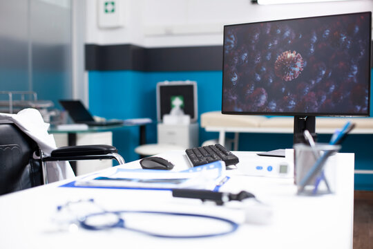 Modern healthcare setup in vacant medical room, focusing on computer screen with virus cells. Empty doctors office with desktop pc representing technology role in treating and researching illness.