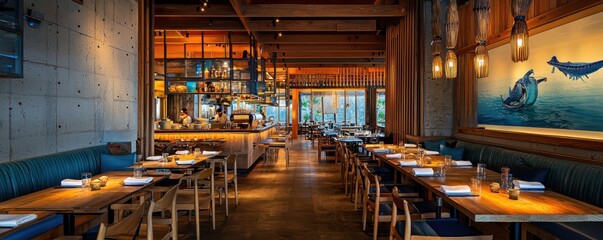 A sustainable seafood restaurant with decor made from ocean-reclaimed materials, offering dishes made from sustainably sourced seafood