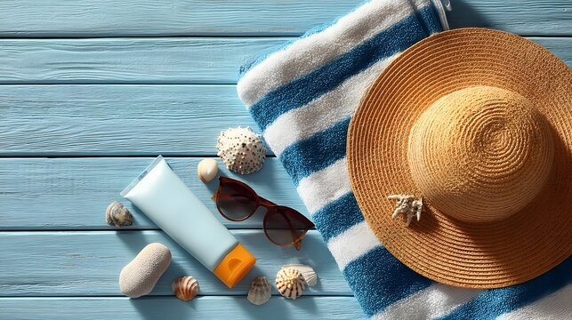 Beach vacation essentials laid out on a wooden surface